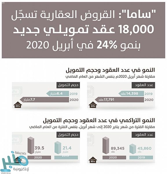 وأوضحت “ساما” عبر نشرتها أن عقود التمويل العقاري الجديدة للأفراد سجلت خلال 2020 -منذ بداية العام حتى نهاية إبريل- نحو 89.345 عقدًا تمويليًا جديدًا بنمو 95% عن نفس الأشهر من العام الماضي الذي بلغ 45.860 عقدًا، فيما نما التمويل حتى نهاية أبريل 85% بنحو 40 مليار ريال حتى إبريل 2020 مقارنة بنحو 21.4 مليار خلال المدة نفسها من العام الماضي 2019م.
