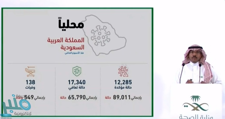 وأضافت الصحة أن إجمالي الحالات في المملكة وصل إلى 89011 حالة حتى الآن .