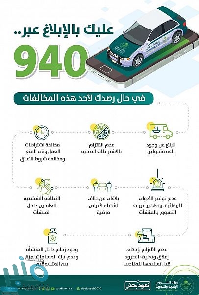 وأوضحت الوزارة أن خدمة 940 متاحة على مدار الساعة لاستقبال البلاغات عن وجود باعة متجولين، وعدم الالتزام بالاشتراطات الصحية، وحالات اشتباه لأعراض مرضية، إضافة إلى البلاغات عن سوء النظافة الشخصية للعاملين داخل المنشآت الغذائية، أو عدم توفير الأدوات الوقائية، وعدم تطهير عربات التسوق بالمنشآت، وعدم الالتزام بإحكام إغلاق وتغليف الطرود قبل تسليمها للمناديب.
