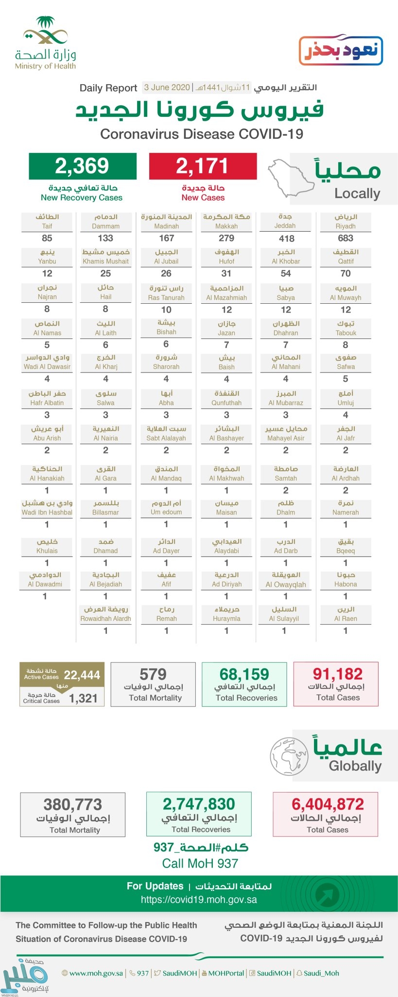 وأضافت الصحة أن إجمالي الحالات في المملكة وصل إلى 91182 حالة حتى الآن .