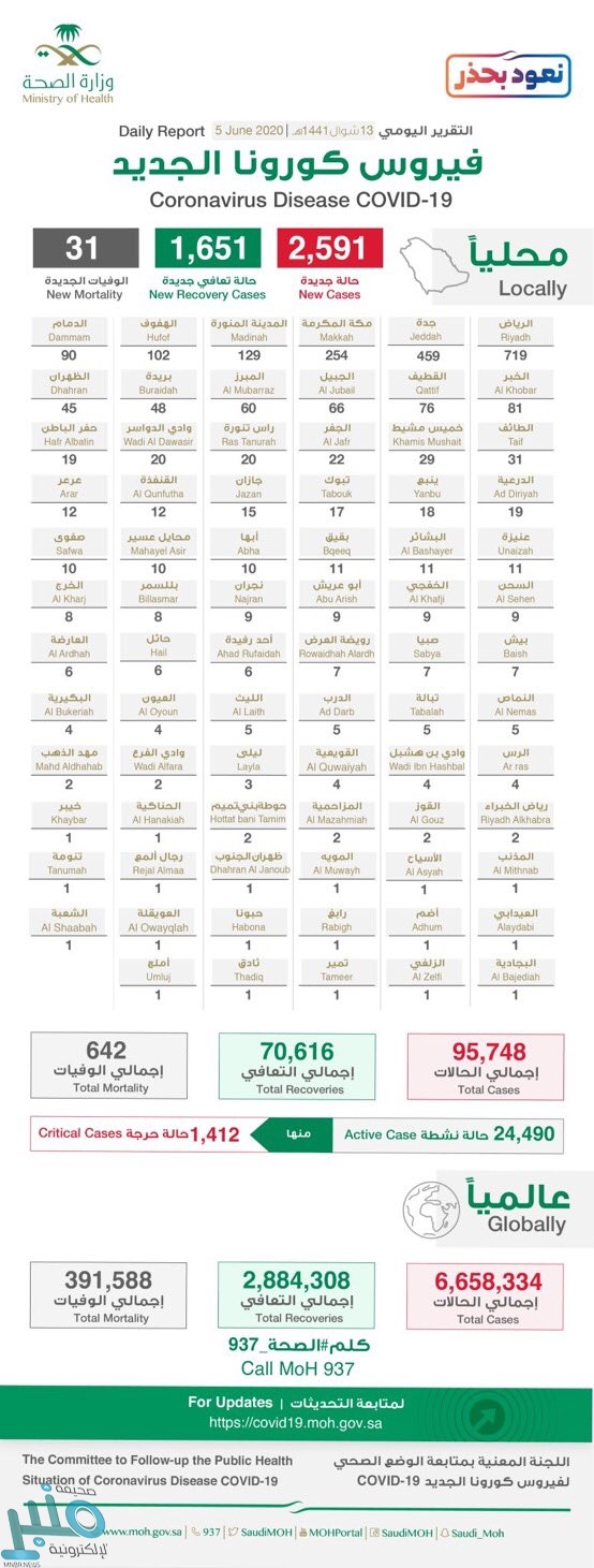 وأضافت الصحة أن إجمالي الحالات في المملكة وصل إلى 95748 حالة حتى الآن .