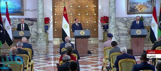 جاء ذلك خلال مؤتمر صحافي للرئيس المصري جمعه مع قائد الجيش الليبي، خليفة حفتر، ورئيس البرلمان الليبي، عقيلة صالح بالقصر الرئاسي في القاهرة.