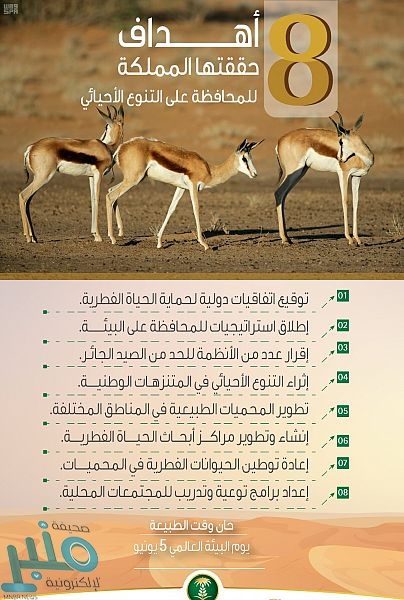 وحققت المملكة ثمانية أهداف للمحافظة على التنوع الأحيائي تضمنت توقيع اتفاقيات دولية لحماية الحياة الفطرية وإطلاق استراتيجيات للمحافظة على البيئة وإقرار عدد من الأنظمة للحد من الصيد الجائر وإثراء التنوع الأحيائي في المتنزهات الوطنية، وتطوير المحميات الطبيعية في المناطق المختلفة، إلى جانب إنشاء وتطوير مراكز أبحاث الحياة الفطرية، وإعادة توطين الحيوانات الفطرية في المحميات، وإعداد برامج توعوية وتدريب للمجتمعات المحلية.