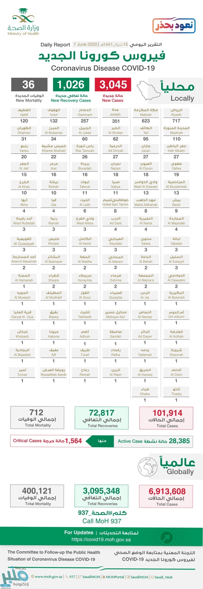 وأضافت الصحة أن إجمالي الحالات في المملكة وصل إلى 101914 حالة حتى الآن .