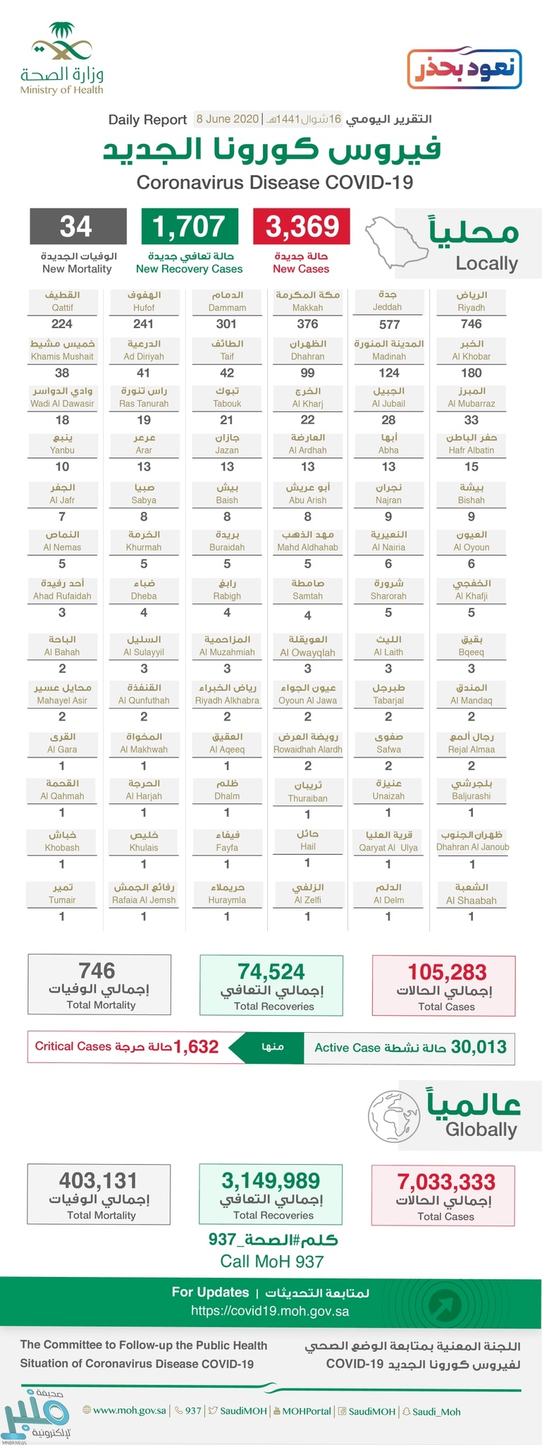 وأضافت الصحة أن إجمالي الحالات في المملكة وصل إلى 105283 حالة حتى الآن .