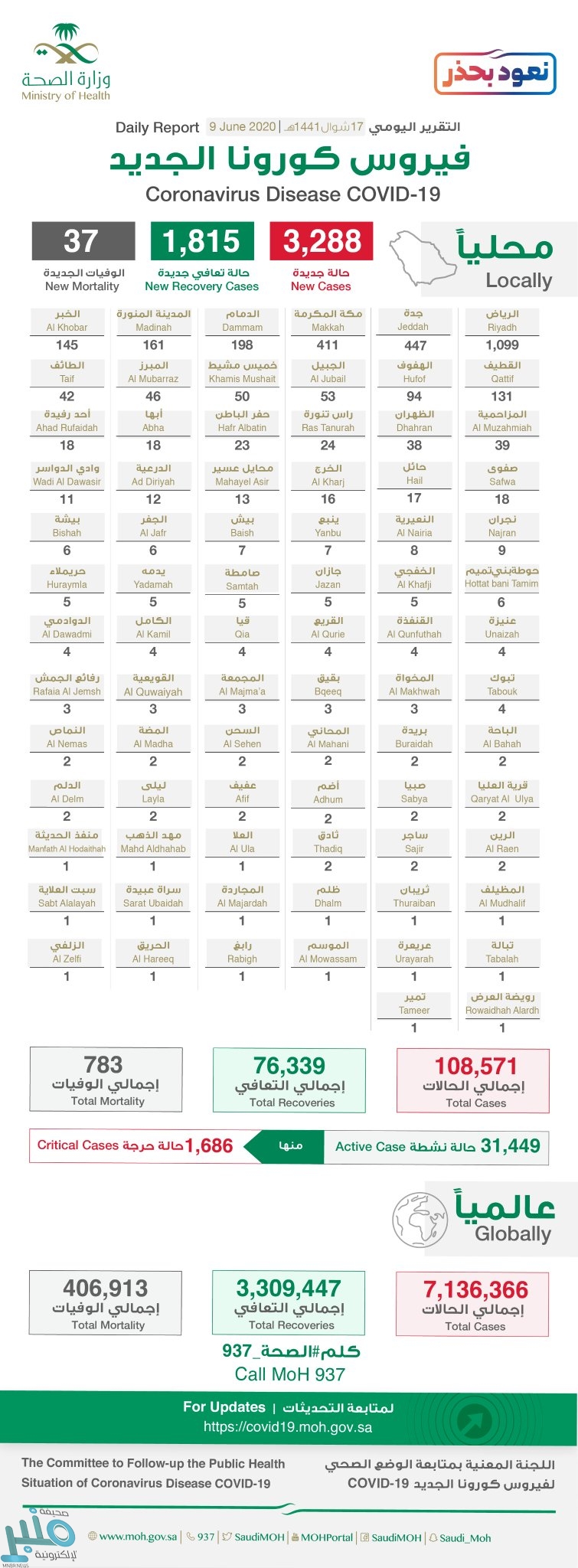 وأضافت الصحة أن إجمالي الحالات في المملكة وصل إلى 108571 حالة حتى الآن .