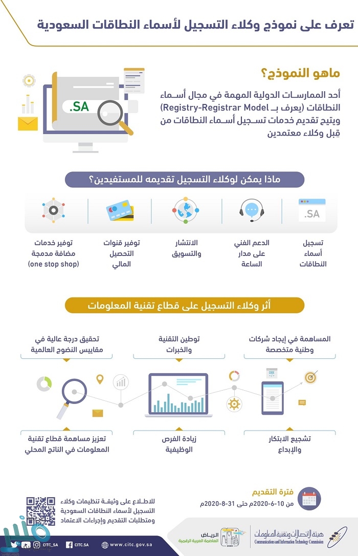 ودعت الهيئة الجهات الراغبة بالحصول على اعتماد كوكيل تسجيل لاستيفاء الاشتراطات التنظيمية الموضحة في الموقع الرسمي للمركز السعودي لمعلومات الشبكة (www.nic.sa)، والتقديم باستخدام النموذج المخصص لذلك خلال فترة التقديم المحددة (من 18-10-1441هـ الموافق 10-6-2020م إلى 12-1-1442هـ الموافق 31-8-2020م).