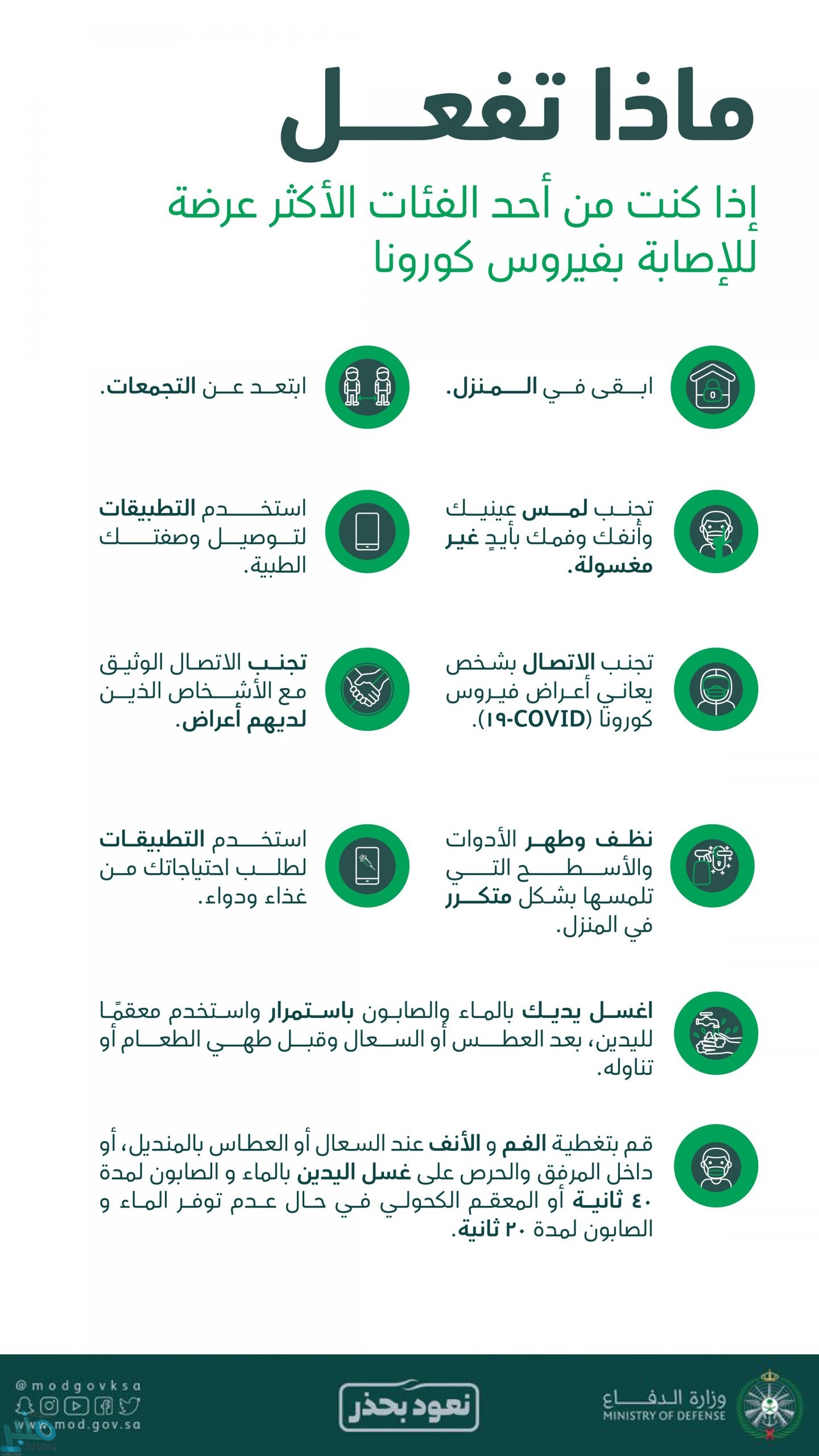 وجّهت وزارة الدفاع 10 نصائح للفئات الأكثر عرضة للإصابة بفيروس كورونا، وذلك لتجنب الإصابة بالمرض، ونشرت الوزارة –عبر حسابها بتويتر- إنفوجرافًا، بينت من خلاله 10 نصائح، هي: