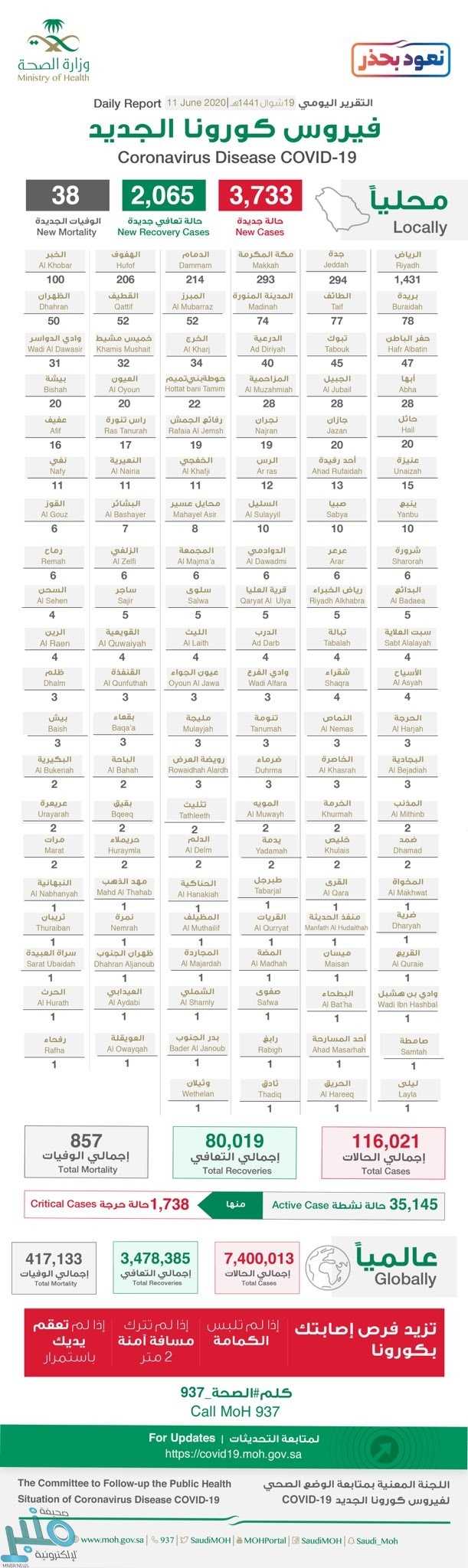 أعلنت وزارة الصحة تسجيل 3733 إصابة جديدة بفيروس كورونا و2065 حالة تعافي و38 حالة وفاة.