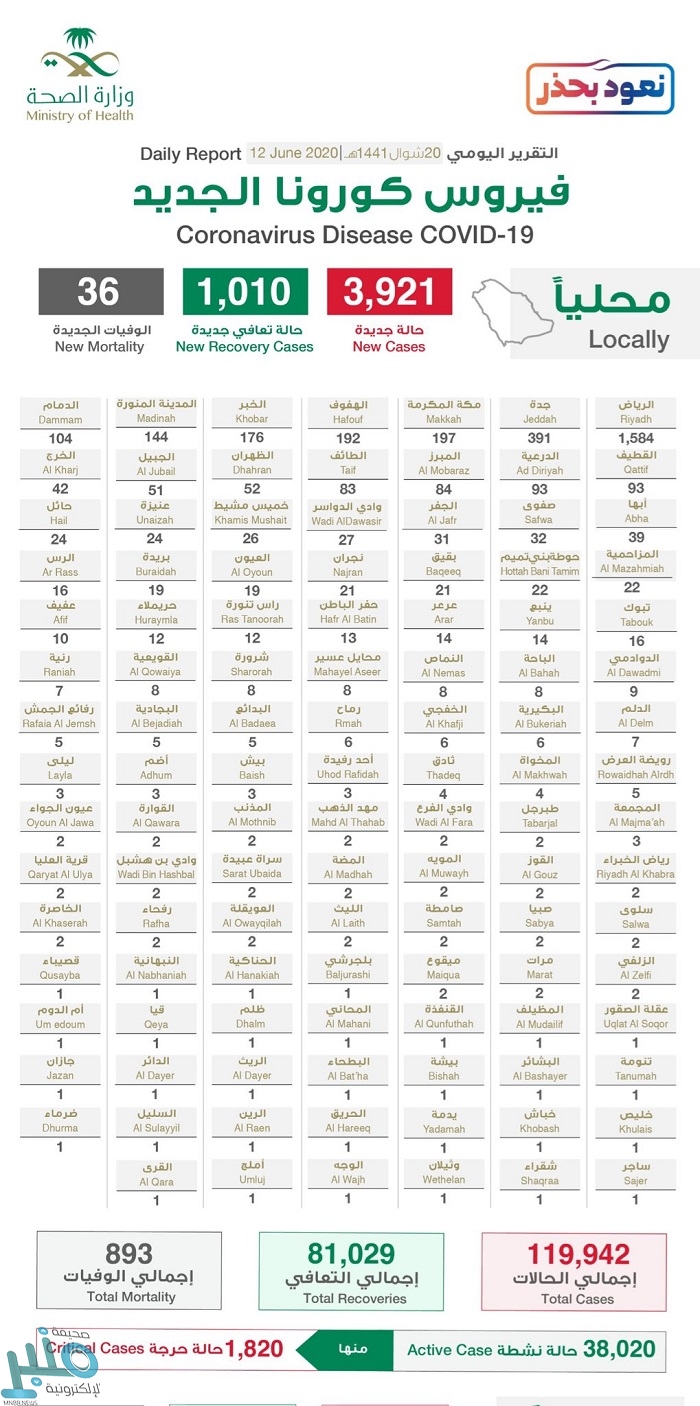 وأضافت الصحة أن إجمالي الحالات في المملكة وصل إلى 119942 حتى الآن .