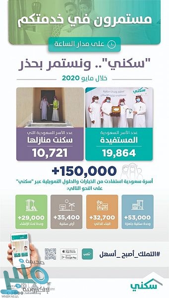 بينها 10 آلاف سكنت منازلها.. “سكني”: 20 ألف أسرة استفادت من الخيارات السكنية خلال مايو الماضي