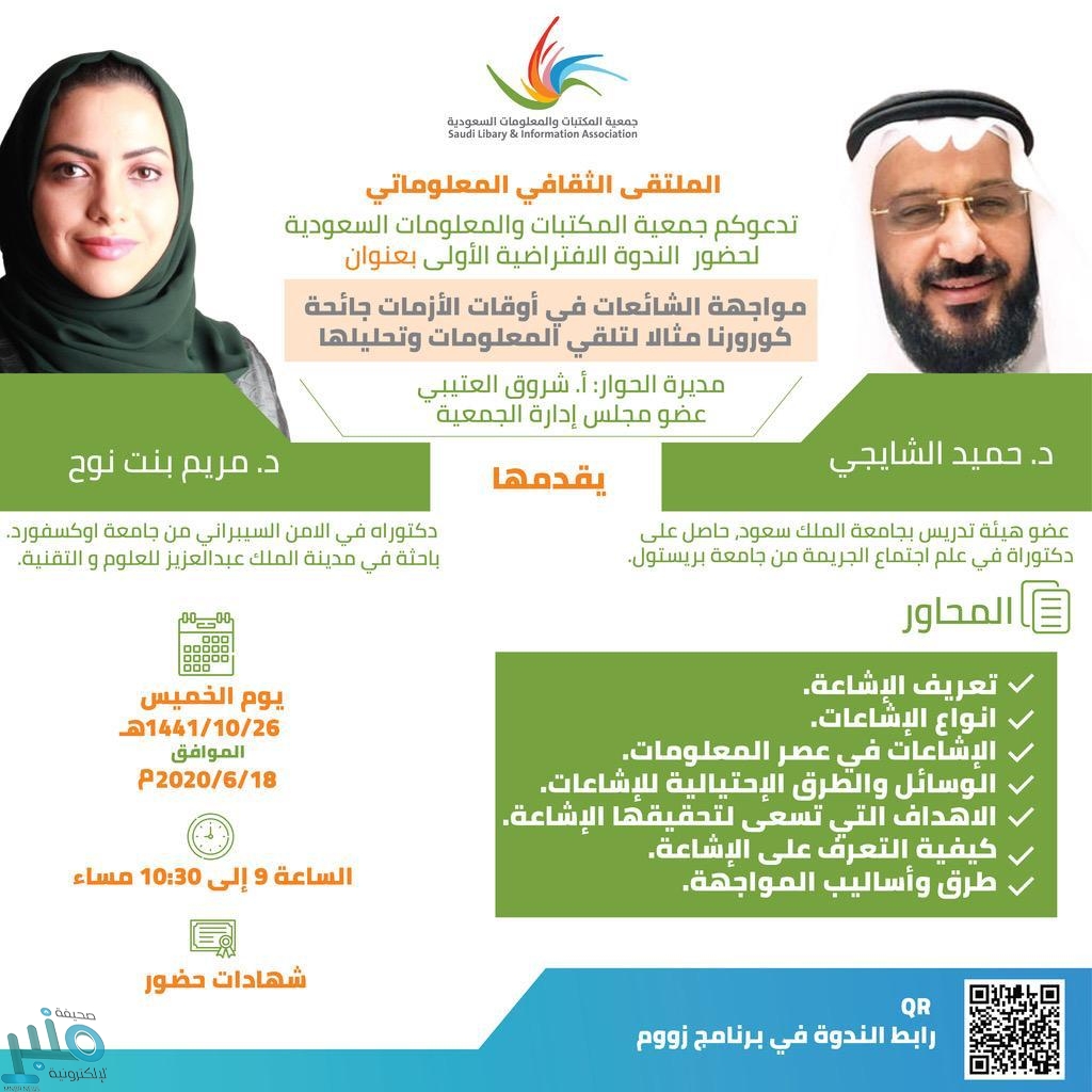 تنظم جمعية المكتبات والمعلومات السعودية الندوة الافتراضية الأولى بعنوان “مواجهة الشائعات في أوقات الأزمات.. جائحة كورونا مثالًا لتلقي المعلومات وتحليلها”، وذلك يوم الخميس المقبل من التاسعة مساءً وحتى 10:30 مساءً، عبر برنامج الزوم.