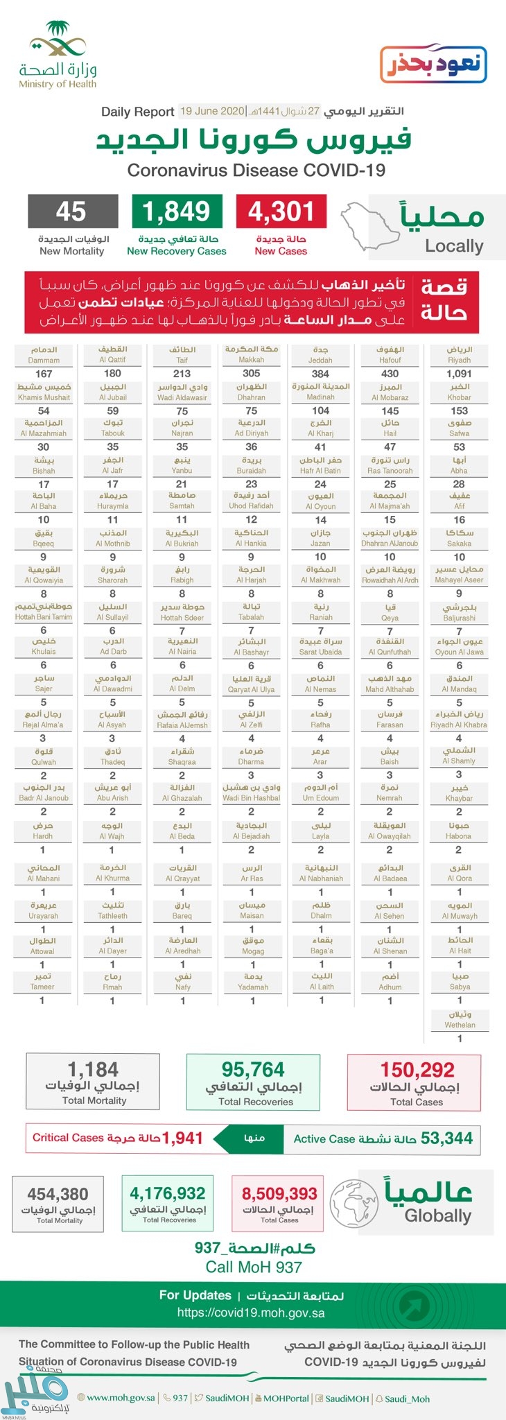 وأضافت الصحة أن إجمالي الحالات في المملكة وصل إلى 150292 حتى الآن .