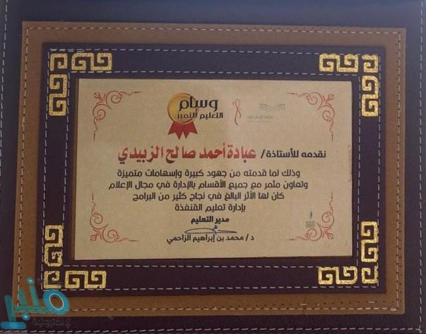 حصلت الأستاذة عبادة أحمد الزبيدي مساعدة مدير الإعلام والاتصال بإدارة تعليم القنفذة على وسام التعليم للتميز، وذلك نظير ما قدمته من جهود كبيرة وتعاون مثمر في جميع الأقسام بالإدارة في مجال الإعلام، كان لها الأثر البالغ في كثير من برامج تعليم القنفذة.