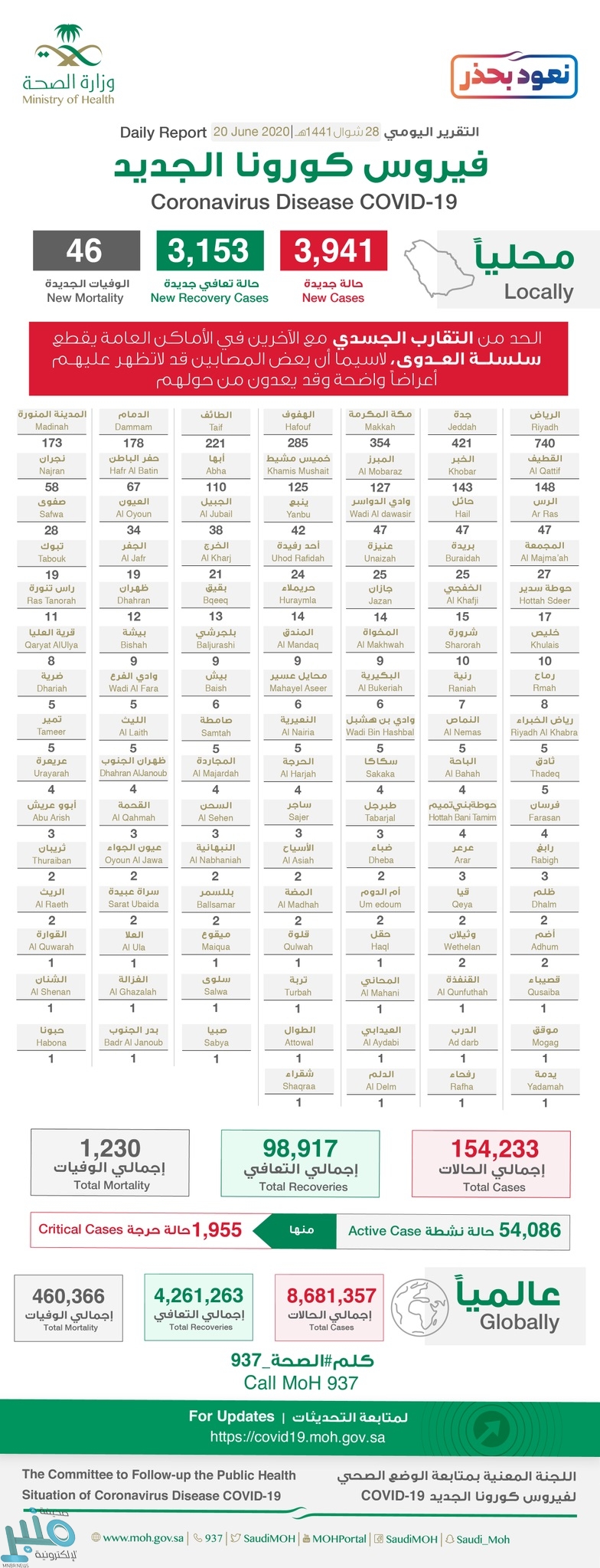 وأضافت الصحة أن إجمالي الحالات في المملكة وصل إلى 154233 حتى الآن .