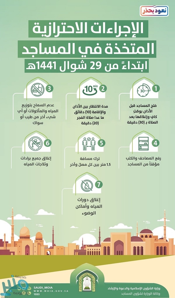 أقرت وزارة الشؤون الإسلامية والدعوة والإرشاد عدداً من الإجراءات الاحترازية والأخذ بالبروتوكولات الصحية في المساجد والجوامع بمختلف مناطق المملكة تزامناً مع عودة الحياة بشكلها الطبيعي .