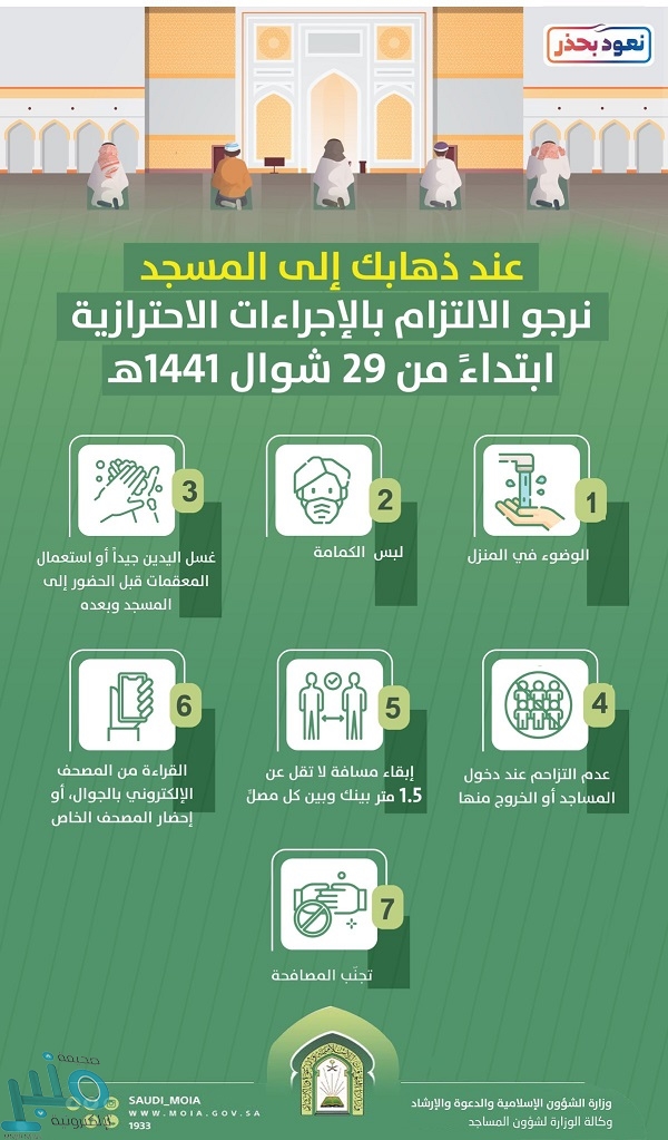 كما تضمنت التزام المصلين بضرورة اتخاذ الإجراءات الاحترازية من لبس الكمامة القماشية، وأن يكون الوضوء في المنزل، وعدم التزاحم عند دخول المساجد أو الخروج منها.