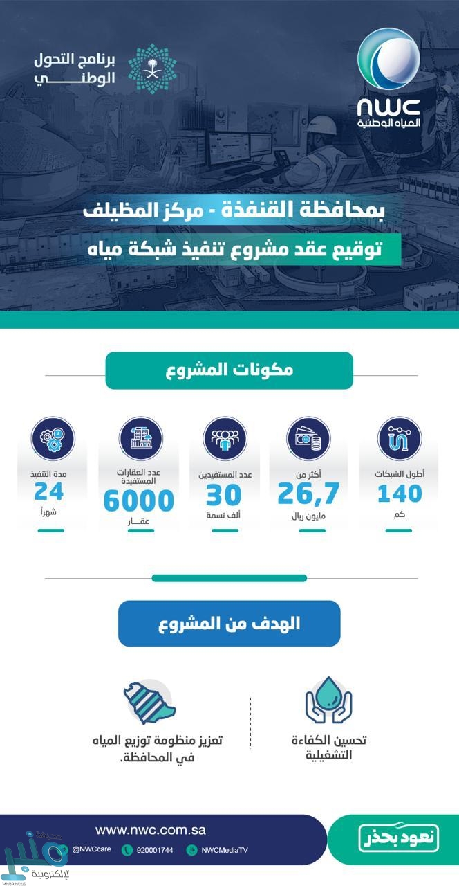 كما وقعت عقدً آخر لتنفيذ شبكة مياه بالمظيلف لخدمة 6000 عقار بتكلفة تزيد على 26,7 مليون ريال، بهدف تحسين الكفاءة التشغيلية، وخدمة أكثر من 30 ألف نسمة.