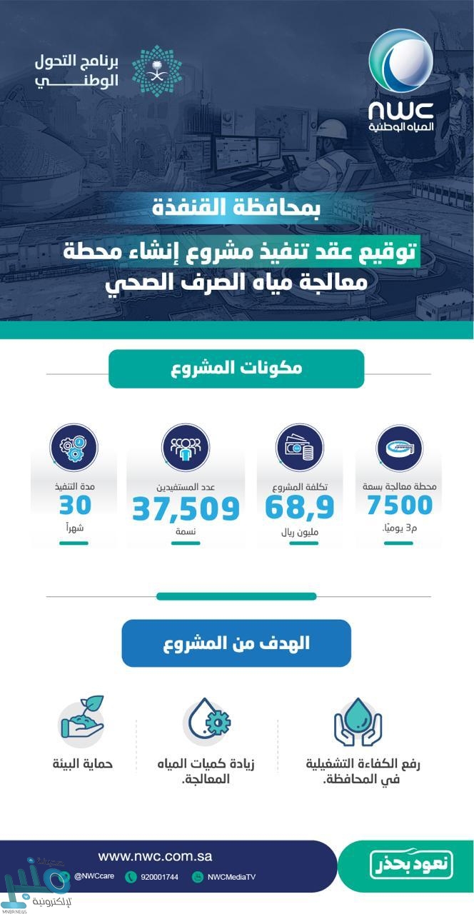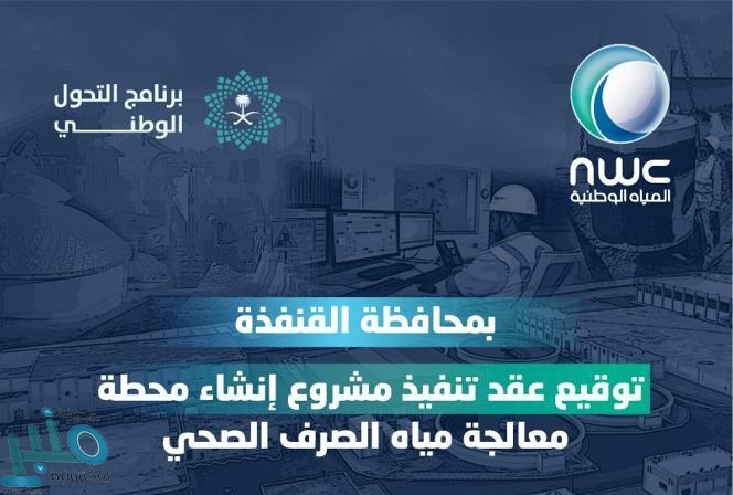 وقعت شركة المياه الوطنية عقد إنشاء محطة لمعالجة مياه الصرف الصحي بمحافظة القنفذة بتكلفة 68,9 مليون ريال، بهدف رفع الكفاءة التشغيلية وحماية البيئة في المحافظة وخدمة أكثر من 37 ألف نسمة، ضمن مبادرات “برنامج التحول الوطني”.