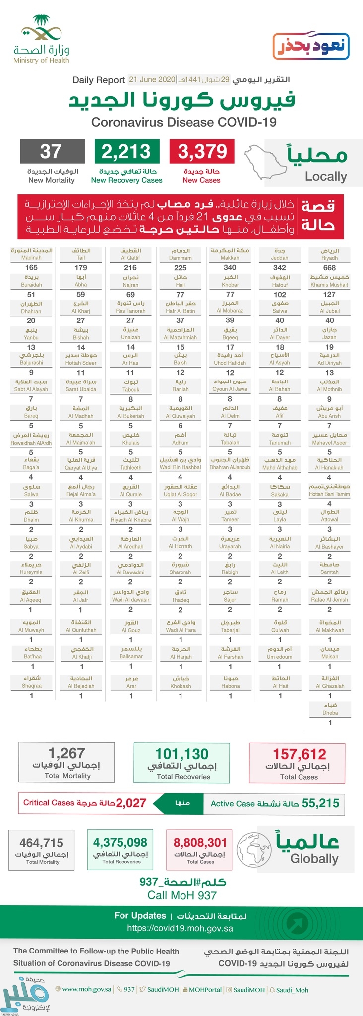وأضافت الصحة أن إجمالي الحالات في المملكة وصل إلى 157612 حتى الآن .