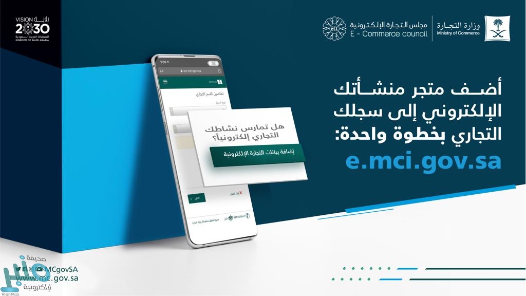 دعت وزارة التجارة عموم الشركات والمؤسسات المزاولة لأنشطة التجارة الإلكترونية إلى إضافة بيانات متاجرها الإلكترونية من خلال خدمة تحديث بيانات السجلات التجارية عبر الرابط: e.mci.gov.sa وذلك تطبيقاً لما نص عليه نظام التجارة الإلكترونية ولائحته التنفيذية.