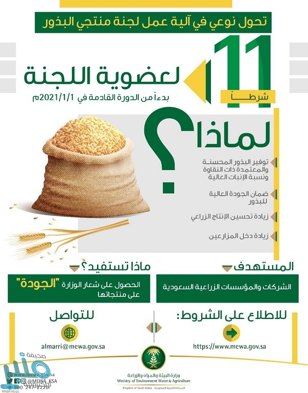 وحثت “الوزارة” الشركات والمؤسسات الزراعية السعودية، على تحقيق الشروط الجديدة ليتسنى لها الانضمام إلى عضوية اللجنة والحصول على شعار الجودة على منتجاتها. داعية إلى التواصل مع مدير عام مركز البذور والتقاوي، رئيس لجنة منتجي البذور الدكتور ناصر المري عبر (almarri@mewa.gov.sa).