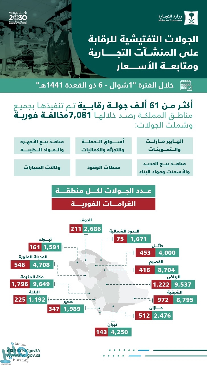 نفذت وزارة التجارة أكثر من 61 ألف جولة رقابية على الأسواق والمنشآت التجارية في جميع مناطق المملكة خلال الفترة من 1 شوال حتى 6 ذي القعدة 1441هـ. وذلك للوقوف على وفرة المنتجات، ومتابعة أسعار السلع الأساسية والاستهلاكية.