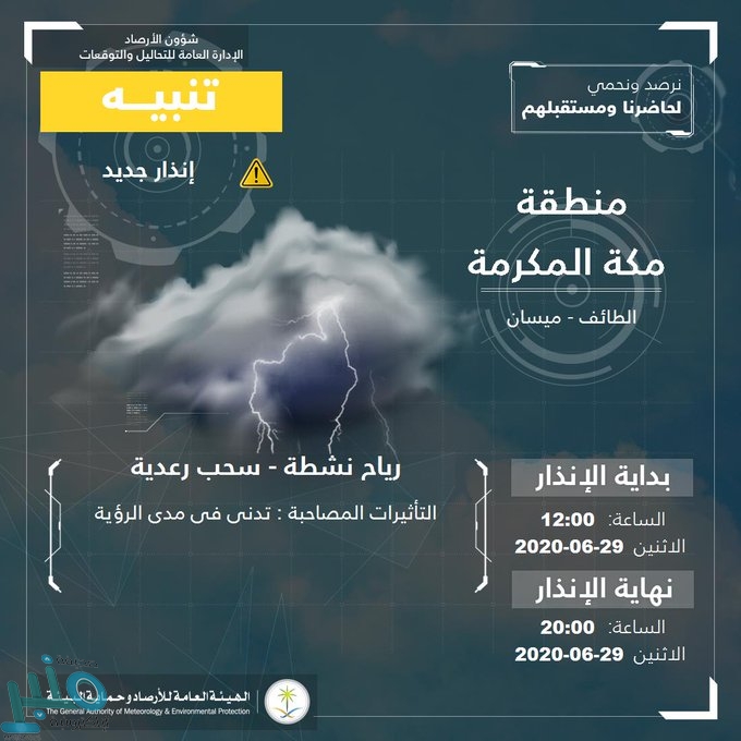 أصدرت الهيئة العامة للأرصاد وحماية البيئة ممثلة في الإدارة العامة للتحاليل والتوقعات اليوم تنبيهاً يتضمن هطول أمطار رعدية على محافظتي الطائف و وميسان مصحوبة بنشاط في الرياح السطحية ، وجريان للسيول، وشبه انعدام للرؤية الأفقية.