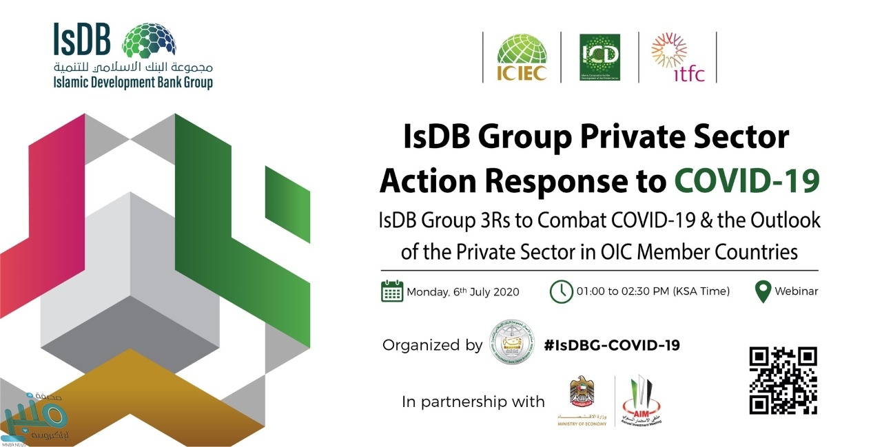 تستضيف مجموعة البنك الإسلامي للتنمية ندوة ( Webinar ) والخاصة باستجابة مجموعة البنك لمواجهة جائحة كورونا (19-COVID) يوم الإثنين الموافق 6 يوليو 2020م، والتي تنظمها مؤسسات القطاع الخاص التابعة لمجموعة البنك الإسلامي للتنمية، بالتعاون مع وزارة الاقتصاد بدولة الإمارات العربية المتحدة، وملتقى الاستثمار السنوي بدبي ( AIM ).