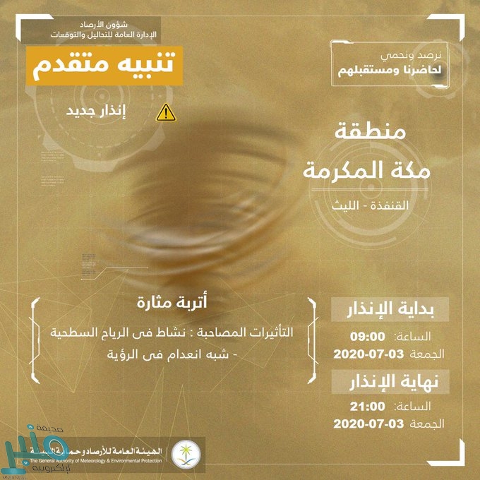 نبّهت الهيئة العامة للأرصاد وحماية البيئة ممثلة في الإدارة العامة للتحاليل والتوقعات في تقريرٍ لها اليوم ، من رياح سطحية نشطة مثيرة للأتربة والغبار قد تؤدي إلى شبه انعدام في مدى الرؤية على محافظتي القنفذة، والليث ،والأجزاء الساحلية .