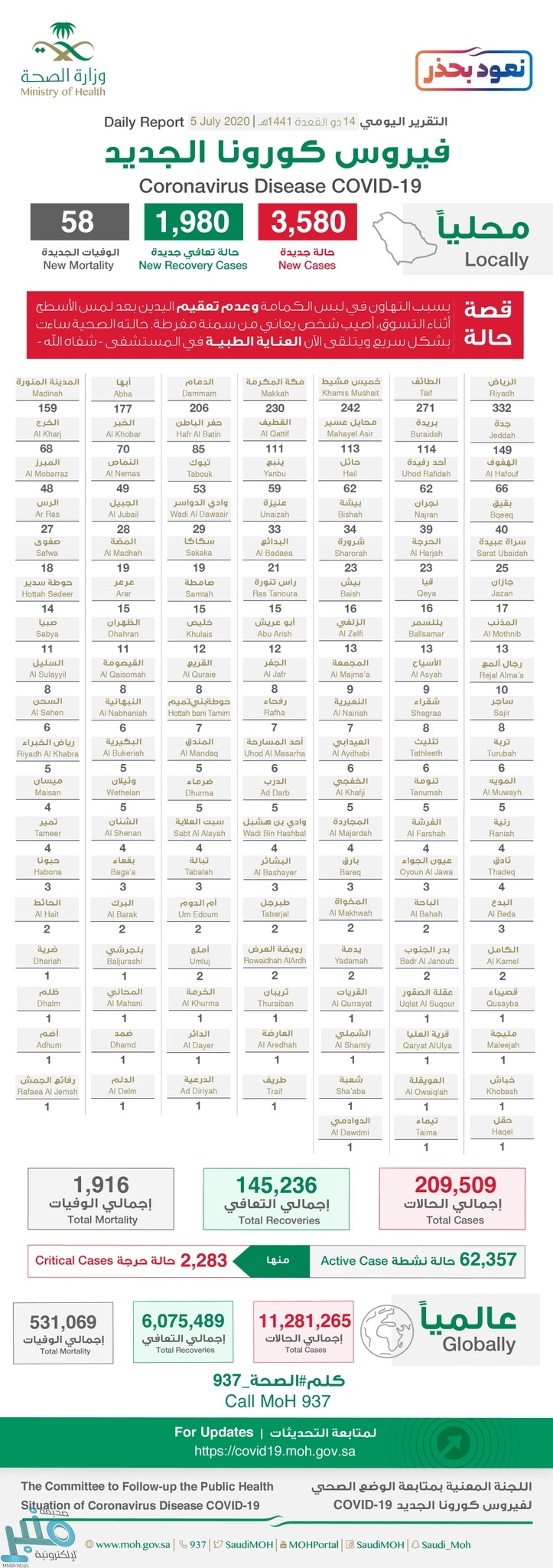 ووفقا لإحصاء «الصحة» اليوم، فقد بلغ إجمالي حالات الإصابة تراكمياً منذ ظهور أول حالة في المملكة 209.509 حالات، من بينها 62.357 حالة نشطة لاتزال تتلقى الرعاية الصحية اللازمة، ومعظمها مطمئنة، منها 2283 حالة حرجة، فيما بلغ إجمالي حالات التعافي 145.236 حالة، في حين ارتفعت حصيلة الوفيات لتبلغ 1916 حالة وفاة.