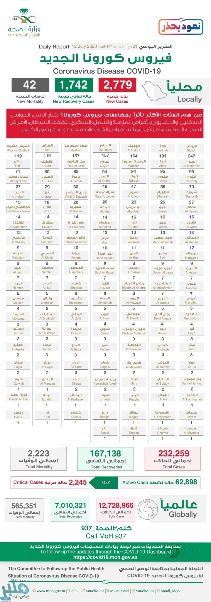 وأضافت الصحة أن إجمالي الحالات في المملكة وصل إلى 232259 حتى الآن .