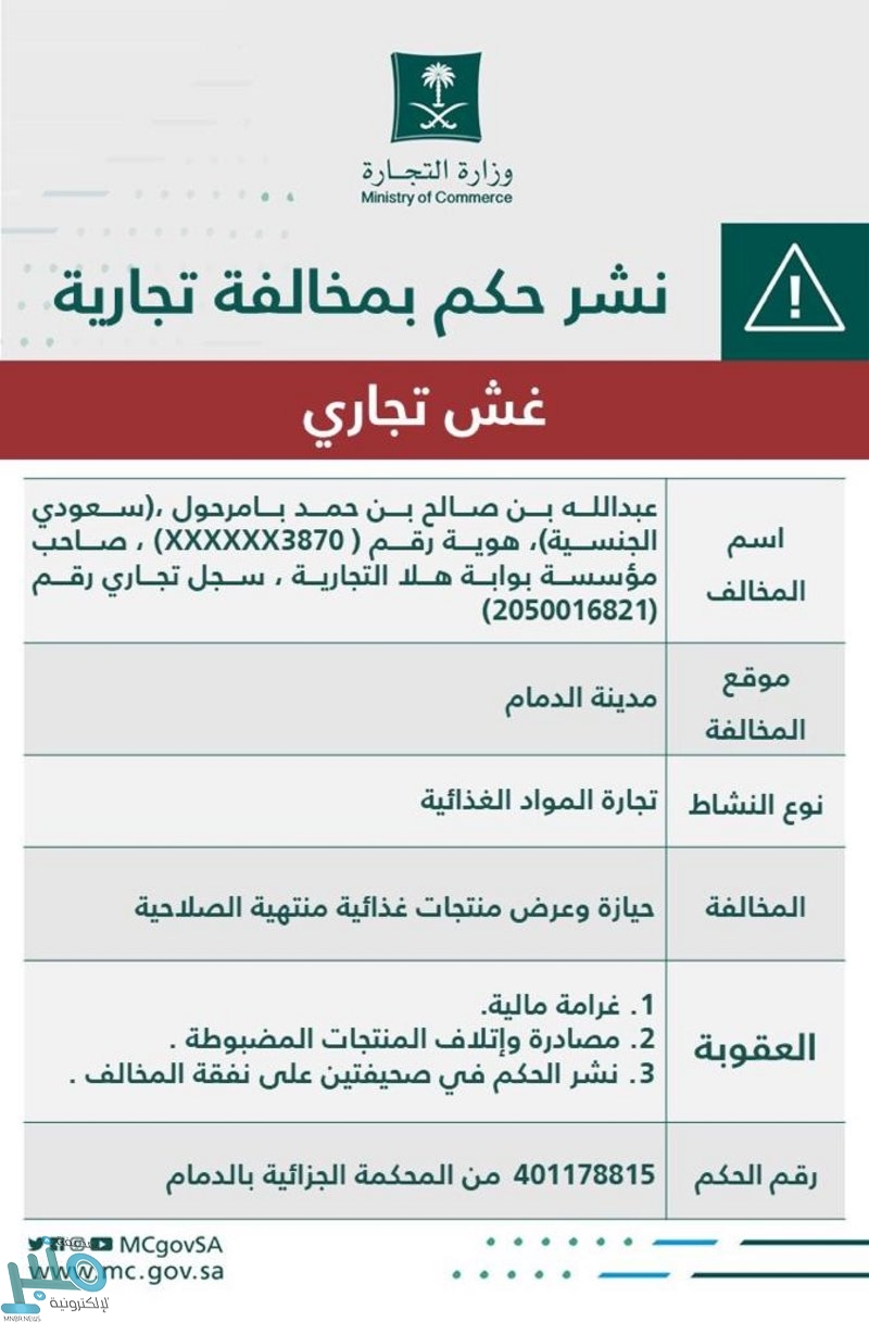 شهَّرت وزارة التجارة بصاحب مؤسسة، تختص بتجارة المواد الغذائية بمدينة الدمام؛ وذلك إثر صدور حكم قضائي بإدانته بمخالفة نظام مكافحة الغش التجاري، وحيازة وعرض منتجات غذائية منتهية الصلاحية، وهو ما يُعدُّ مخالفة تستوجب العقوبة بالنظر لما تشكِّله تلك المنتجات من خطورة على صحة وسلامة المستهلك.