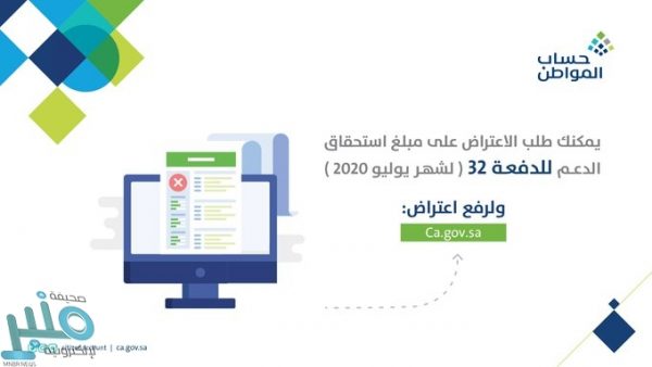 أعلن برنامج حساب المواطن، اليوم (الثلاثاء)، أنه بدأ استقبال طلبات الاعتراض على مبلغ استحقاق الدعم للدفعة الـ32 الخاصة بشهر يوليو 2020.