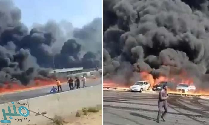 وأظهرت لقطات فيديو نشرت عبر مواقع التواصل الاجتماعي حريقا ضخما امتد لمسافة نحو مئة متر ويلتهم عددا من السيارات على الطريق.