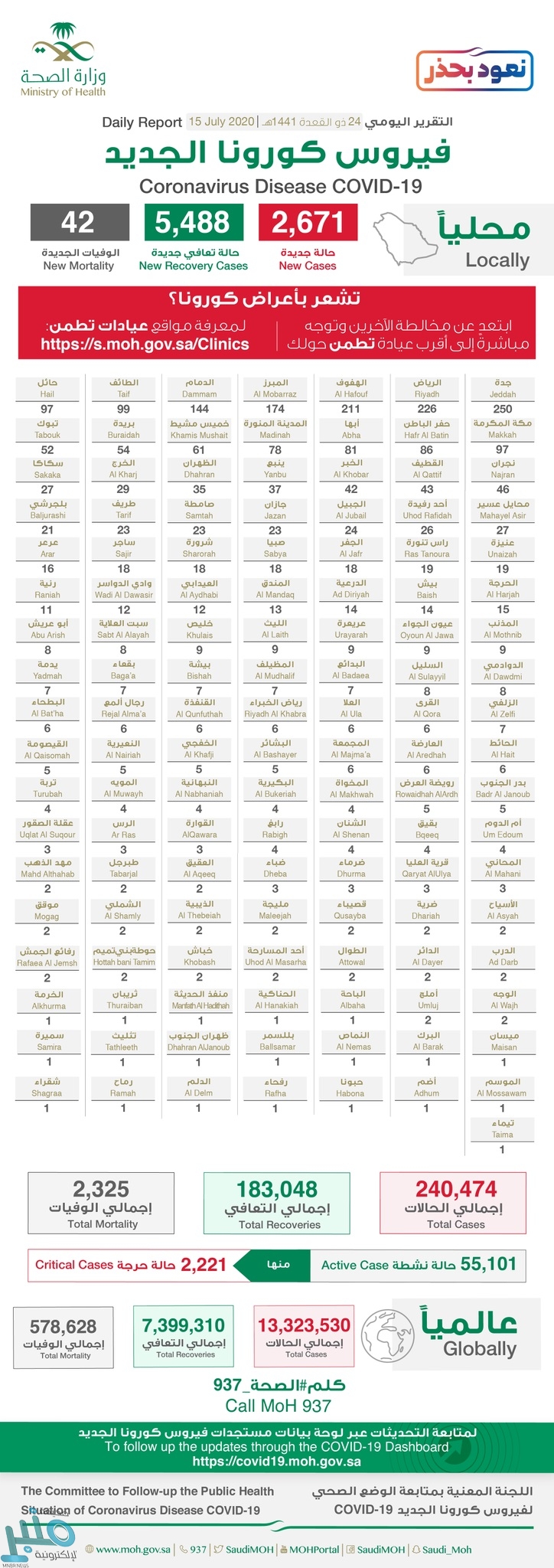 وأضافت الصحة أن إجمالي الحالات في المملكة وصل إلى 240474 حتى الآن .