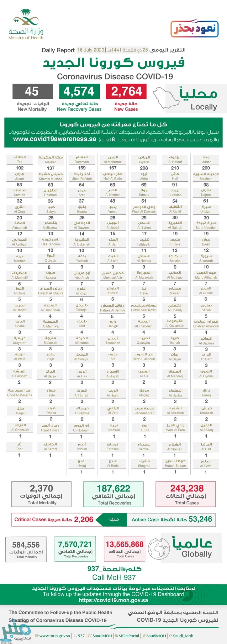 أعلنت وزارة الصحة، اليوم الخميس 16 يوليو 2020، تسجيل 2764 حالة إصابة جديدة بفيروس كورونا الجديد (كوفيد-19) ليصبح الإجمالي 243238 حالة .