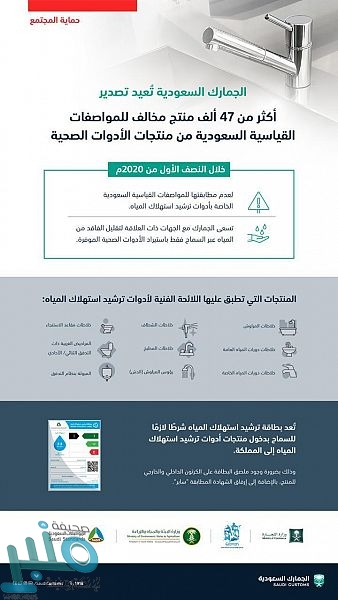 أعادت الجمارك السعودية خلال النصف الأول من عام 2020م تصدير أكثر من 47 ألف منتج من منتجات الأدوات الصحية التي تشمل (الخلاطات بجميع أنواعها والمراحيض الغربية (ذات التدفق الأحادي/الثنائي والمبولة بنظام التدفق)؛ لعدم مطابقتها للمواصفات القياسية السعودية الخاصة بأدوات ترشيد استهلاك المياه.