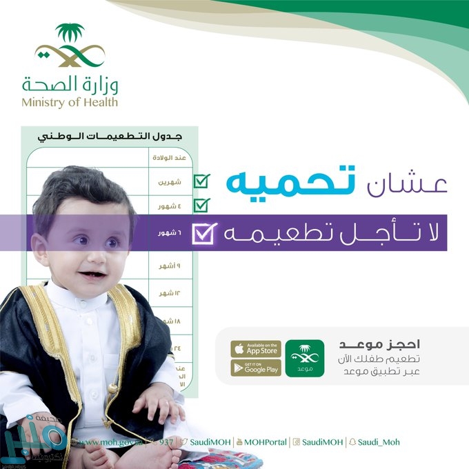 وأوضحت الوزارة عبر إنفوجرافيك نشرته في حسابها على ” تويتر ” ضمن حملتها التوعوية ” #لا_تأجلها ” أن التطعيمات تُعد من الإجراءات الإحترازية الأساسية؛ لحفظ الصحة، ووسيلة للحماية من الأمراض المعدية، وأن تأخير تطعيمات الطفل تعرضه لإحتمالية إصابته بأمراض خطيرة .