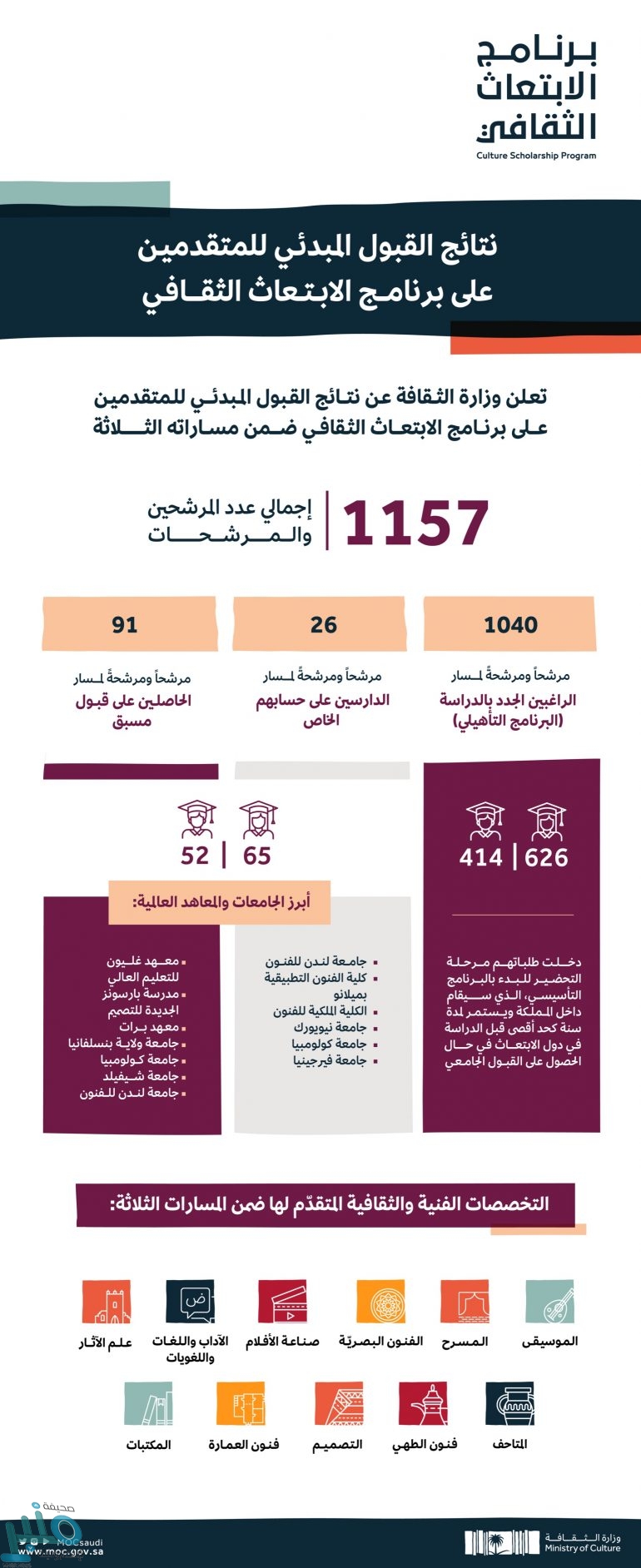وشهدت المنصة الإلكترونية للبرنامج منذ بدء استقبال الطلبات في شهر يناير الماضي، إقبالاً كبيراً من الراغبين في دراسة التخصصات الفنية والثقافية في الجامعات والمعاهد العالمية، حيث بلغ عدد المقبولين مبدئياً ضمن مسار الراغبين الجدد بالدراسة 1040 مرشحاً ومرشحة، وذلك بعد تدقيق ومطابقة بياناتهم، وتنوعت تخصصاتهم بين التصميم وصناعة الأفلام والموسيقى وفنون الطهي والمسرح والمكتبات والمتاحف وفنون العمارة والفنون البصرية والآداب واللغات واللغويات وعلم الآثار, ودخلت طلباتهم مرحلة التحضير للبدء بالبرنامج التأسيسي الذي سيقام داخل المملكة ويستمر لمدة سنة كحد أقصى قبل الدراسة في دول الابتعاث، علماً بأن هذا البرنامج سيكون عن طريق الإنترنت بسبب الظروف الراهنة المرتبطة بجائحة كورونا.