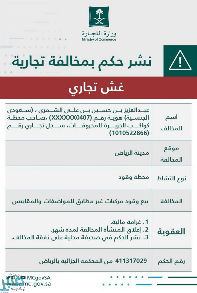 شهَّرت وزارة التجارة بمواطن؛ وذلك إثر صدور حكم قضائي بثبوت مخالفته “بيع وقود مركبات غير مطابق للمواصفات والمقاييس” في مدينة الرياض.