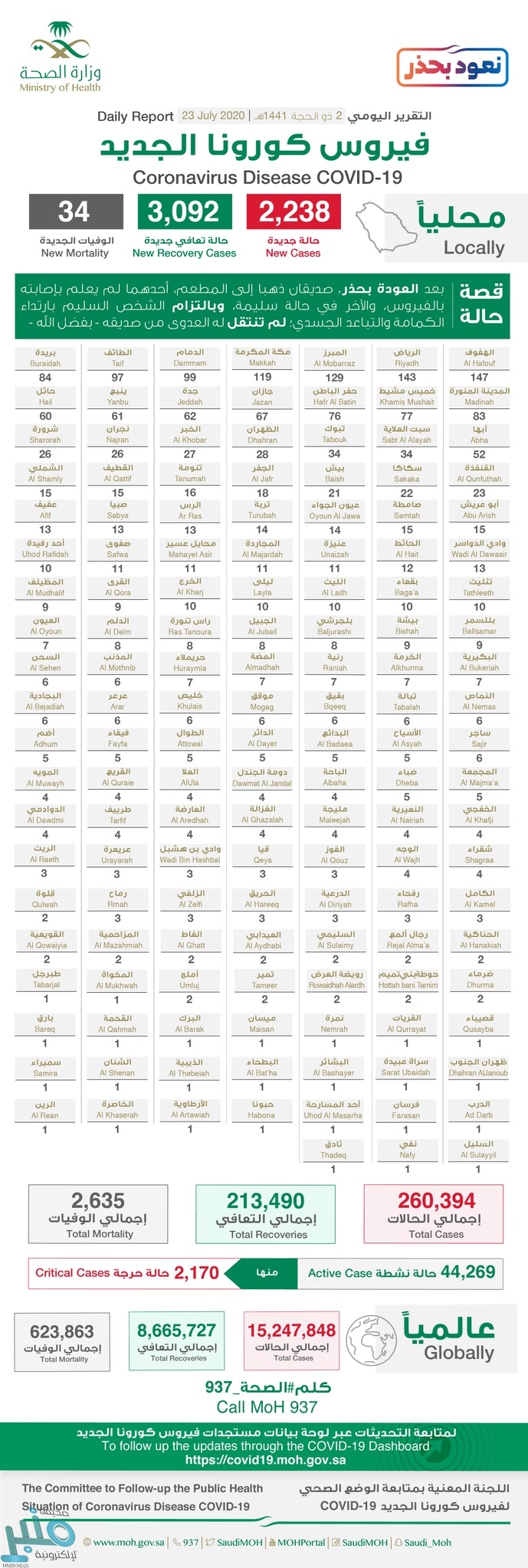 وأضافت الصحة أن إجمالي الحالات في المملكة وصل إلى 260364 حتى الآن .