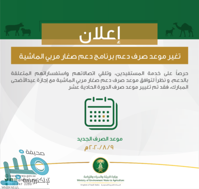 أعلنت وزارة البيئة والمياه والزراعة عن تغير موعد صرف الدورة الحادية عشرة من دفعة برنامج دعم صغار مربي الماشية ليكون في 2020/8/9م .