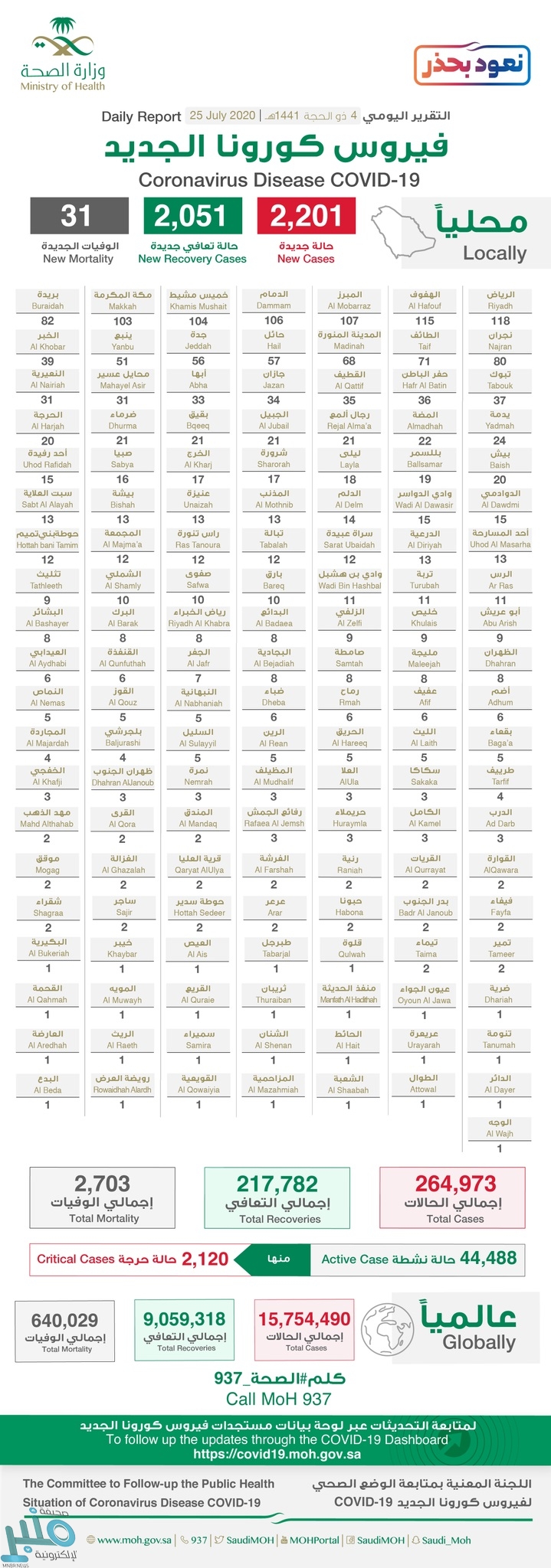 وأضافت الصحة أن إجمالي الحالات في المملكة وصل إلى 264973 حتى الآن .