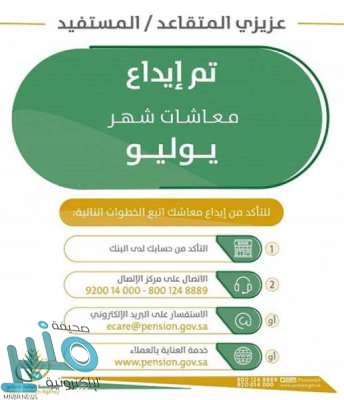 أعلنت المؤسسة العامة للتقاعد عن إيداعها لمعاشات عملائها التقاعدية لشهر يوليو 2020م، والتي بلغت أكثر من 6.6 مليار ريال موزعة على أكثر من 1.2 مليون متقاعد ومستفيد.