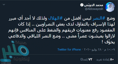 وكتب الدويش عبر حسابه الرسمي تويتر: “وضع النصر ليس أفضل من الهلال ولذلك لا أجد أي مبرر لهذا الإسراف بالتفاؤل لدى بعض النصراويين .. إذا كان المقصود رفع معنويات فريقهم والضغط على المنافس فإنهم لازالوا يعيشون عصراً مضى.. وضع النصر اللياقي والدفاعي يخوّف !”.