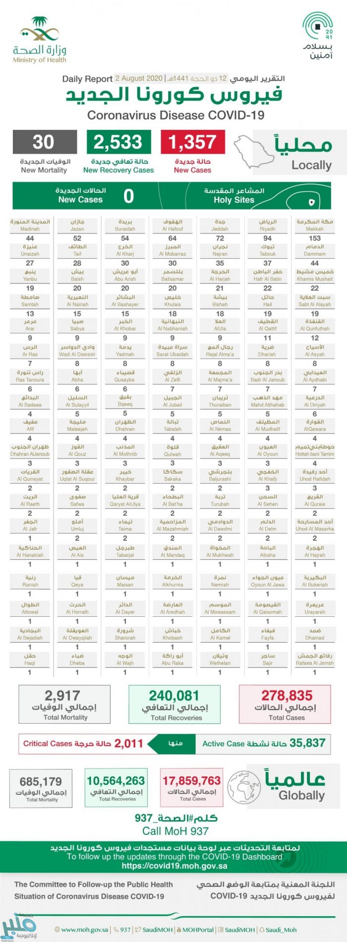 وأضافت الصحة أن إجمالي الحالات في المملكة وصل إلى 278835 حتى الآن .