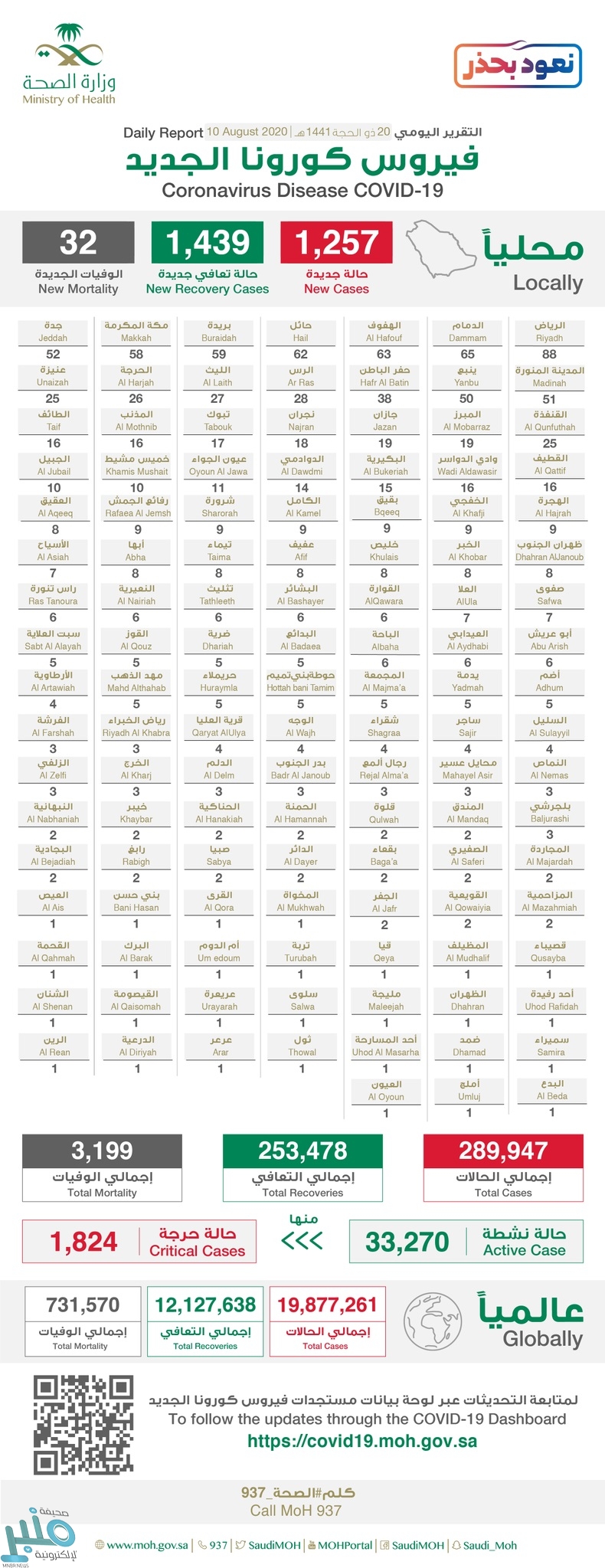 وأوضحت أنه تم تسجيل 32 وفيات جديدة في المملكة، ليصل إجمالي الوفيات إلى 3199 حالة.