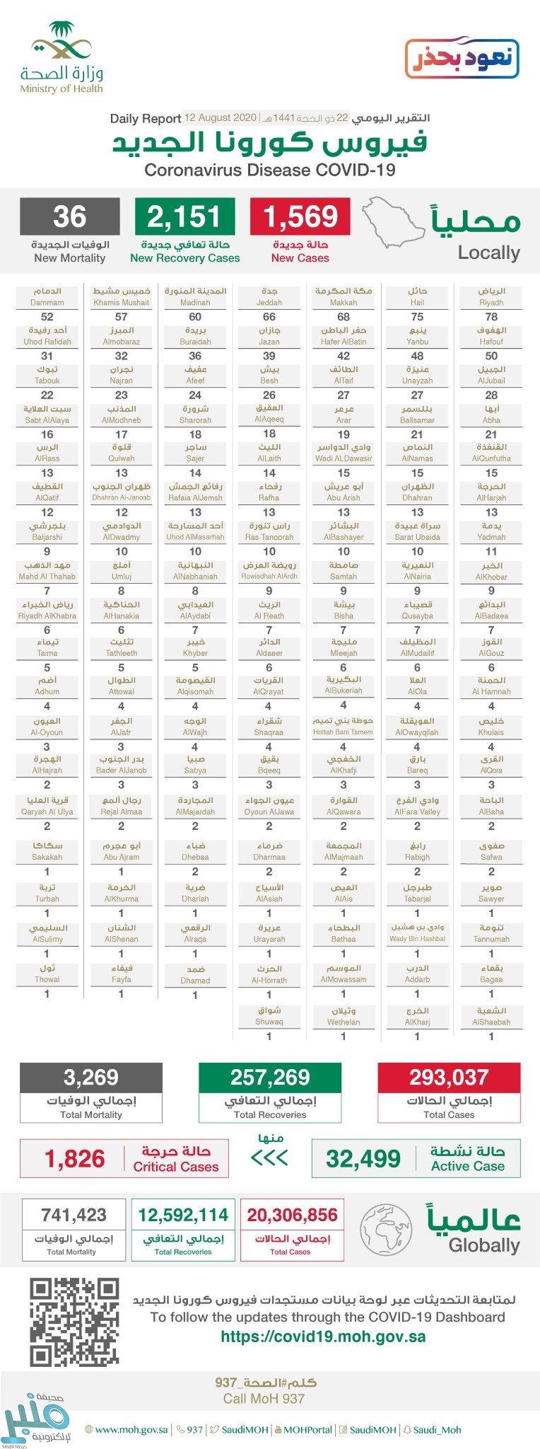 وأوضحت أنه تم تسجيل 36 وفيات جديدة في المملكة، ليصل إجمالي الوفيات إلى 3269 حالة.