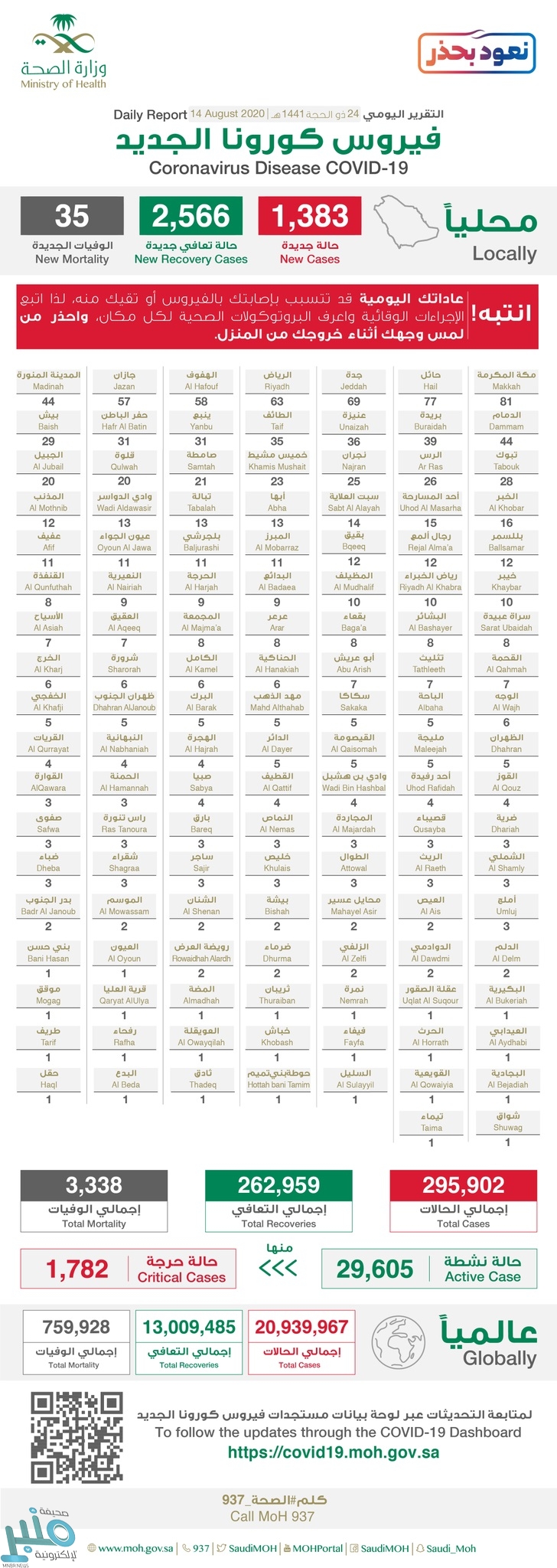 وأوضحت أنه تم تسجيل 35 وفيات جديدة في المملكة، ليصل إجمالي الوفيات إلى 3338 حالة.